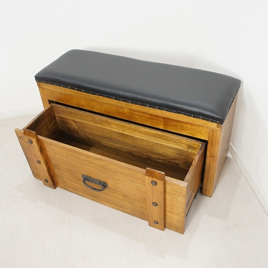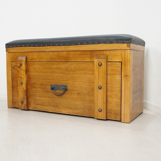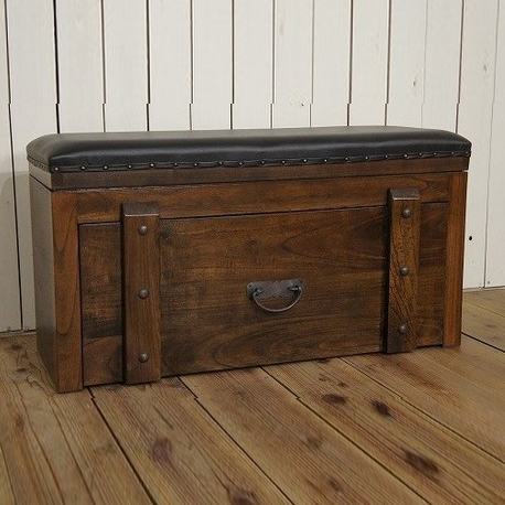 ヴィンテージ風ベンチ型 ボックス チェスト です。 木目も綺麗ではっきりとわかる着色で、手の込んだつくりをしています。 上蓋が開きまたレール付きの引き出しもあります。 クールでレトロな空間にとてもよく似合うと思います。
