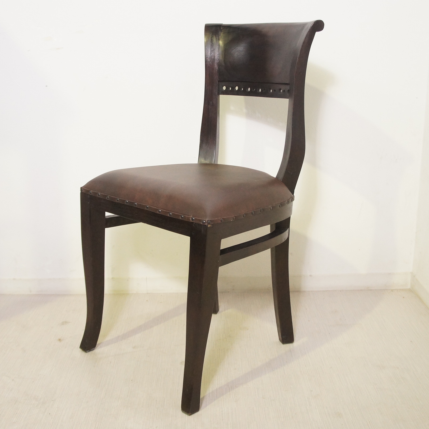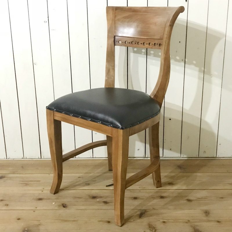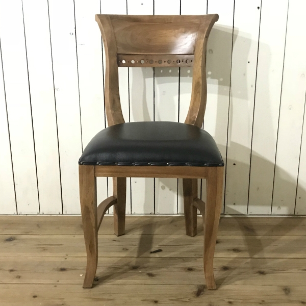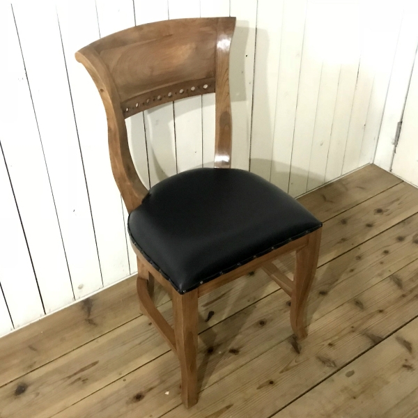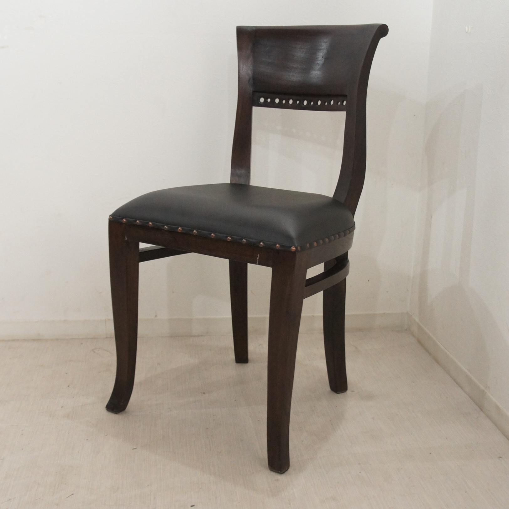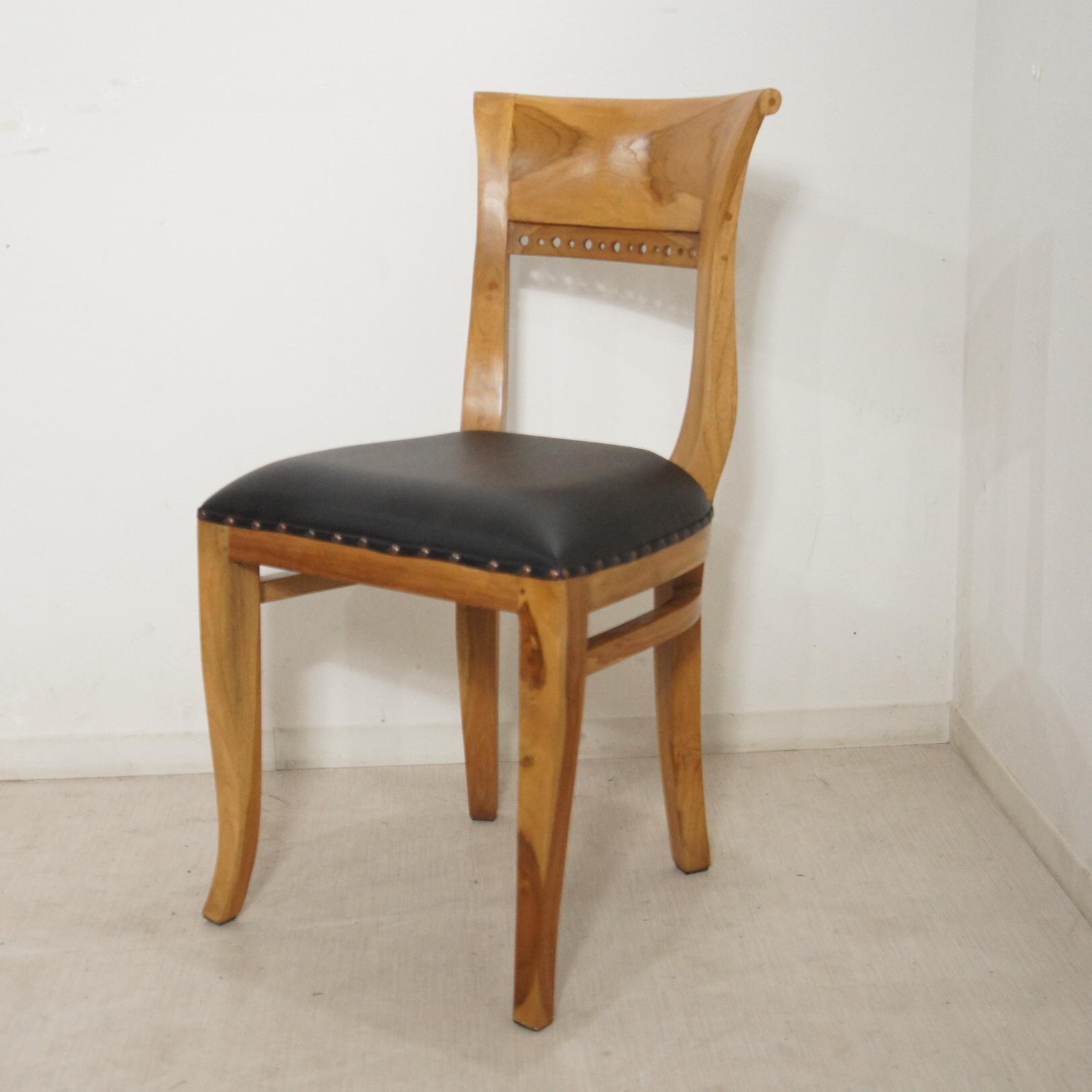 チークフレームのクッションダイニングチェアです。 硬く強度の強いチーク材フレームと合皮貼りのクッションで座り心地のいい椅子となっています。 デザインも洗練されたヨーロッパの伝統的なデザインです。