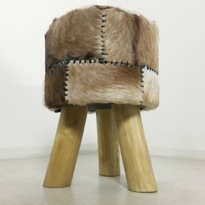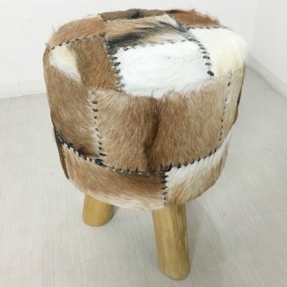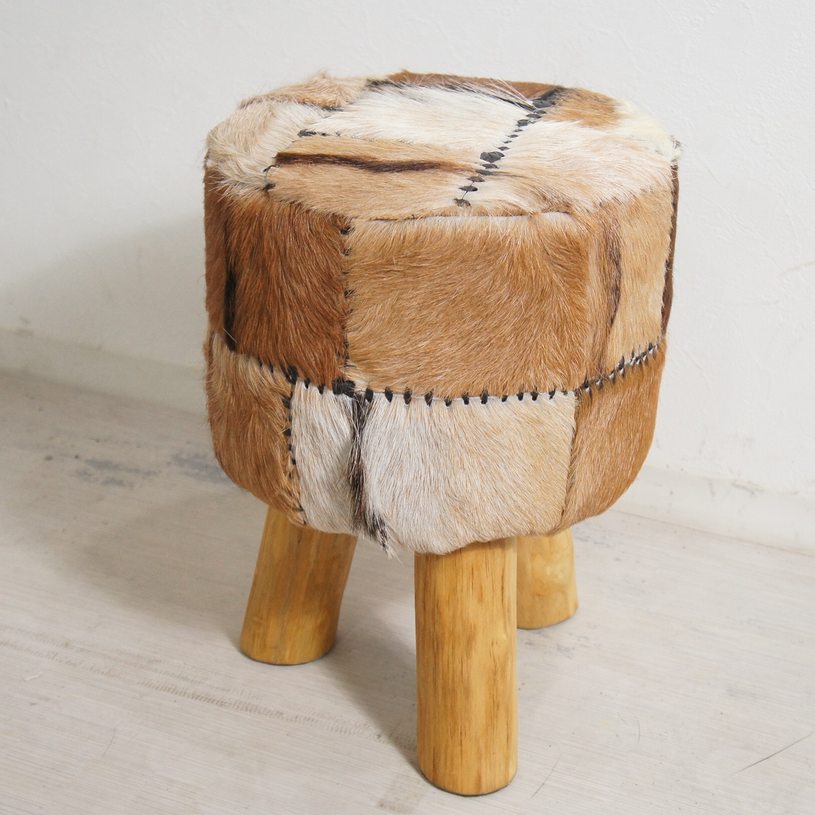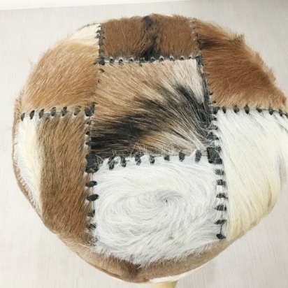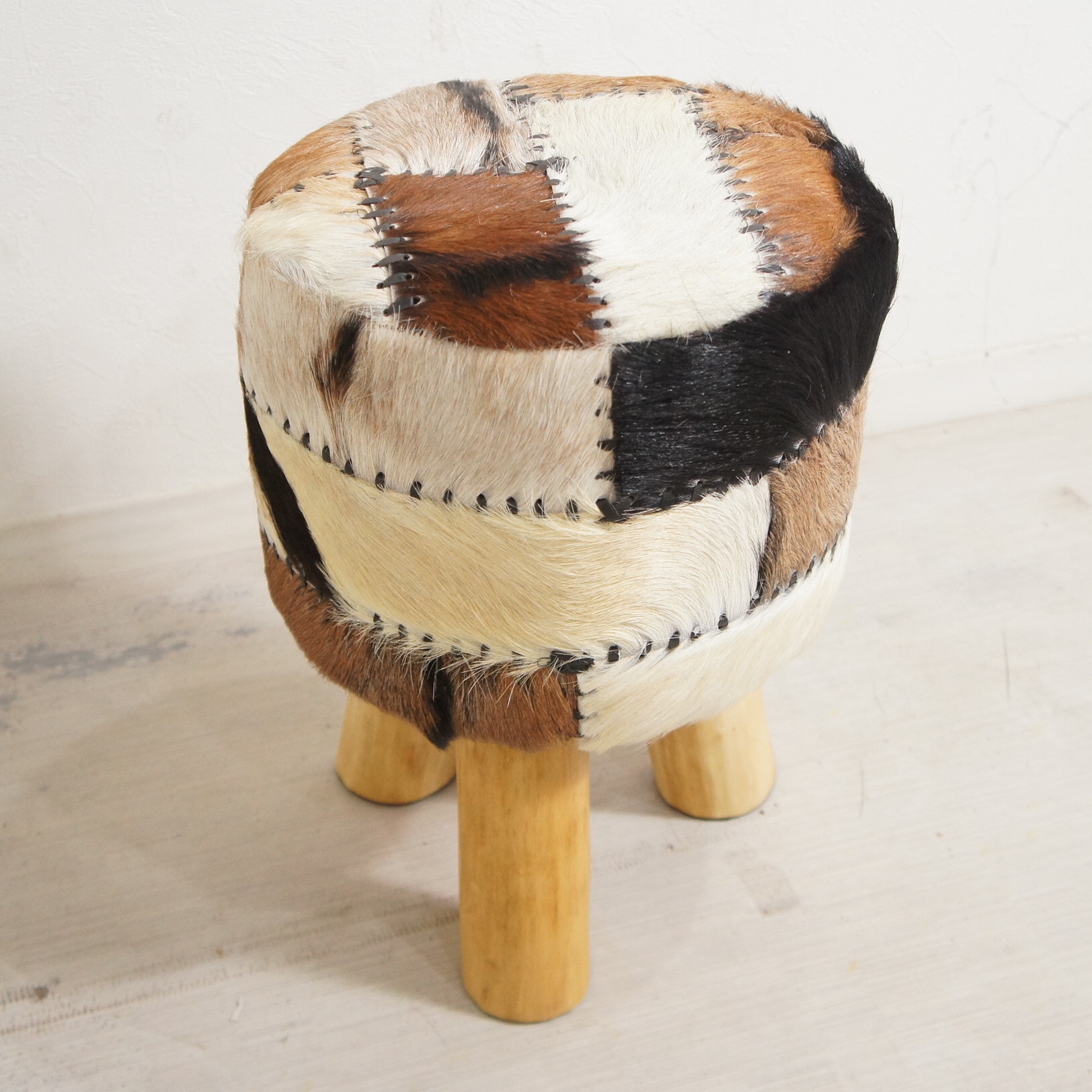 パッチワークに張り付けた毛皮を革紐でステッチしてあります。