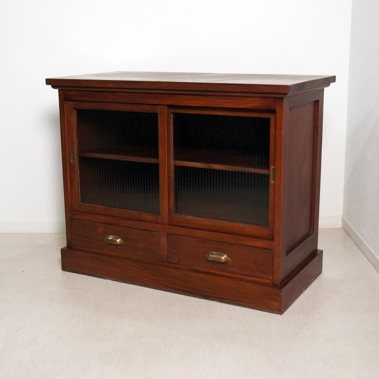 昭和レトロな雰囲気のモールガラスキャビネットです。 高さが約75cmと低めの作りですので、上部を飾りスペース等、有効に使っていただけます。
