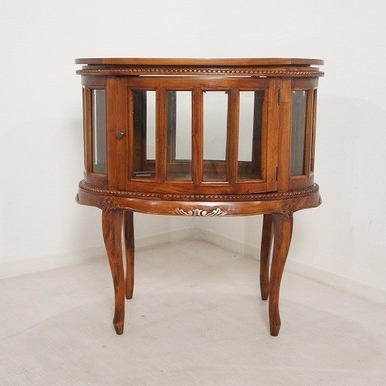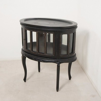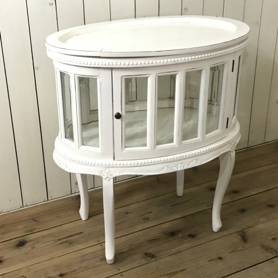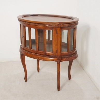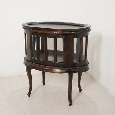 オーバル型両開き扉のティーテーブルです。 ガラスキャビネット内にティーカップ等収納できます。 上部はトレイになっていて便利です。 ティータイムが楽しくなりそうです。
