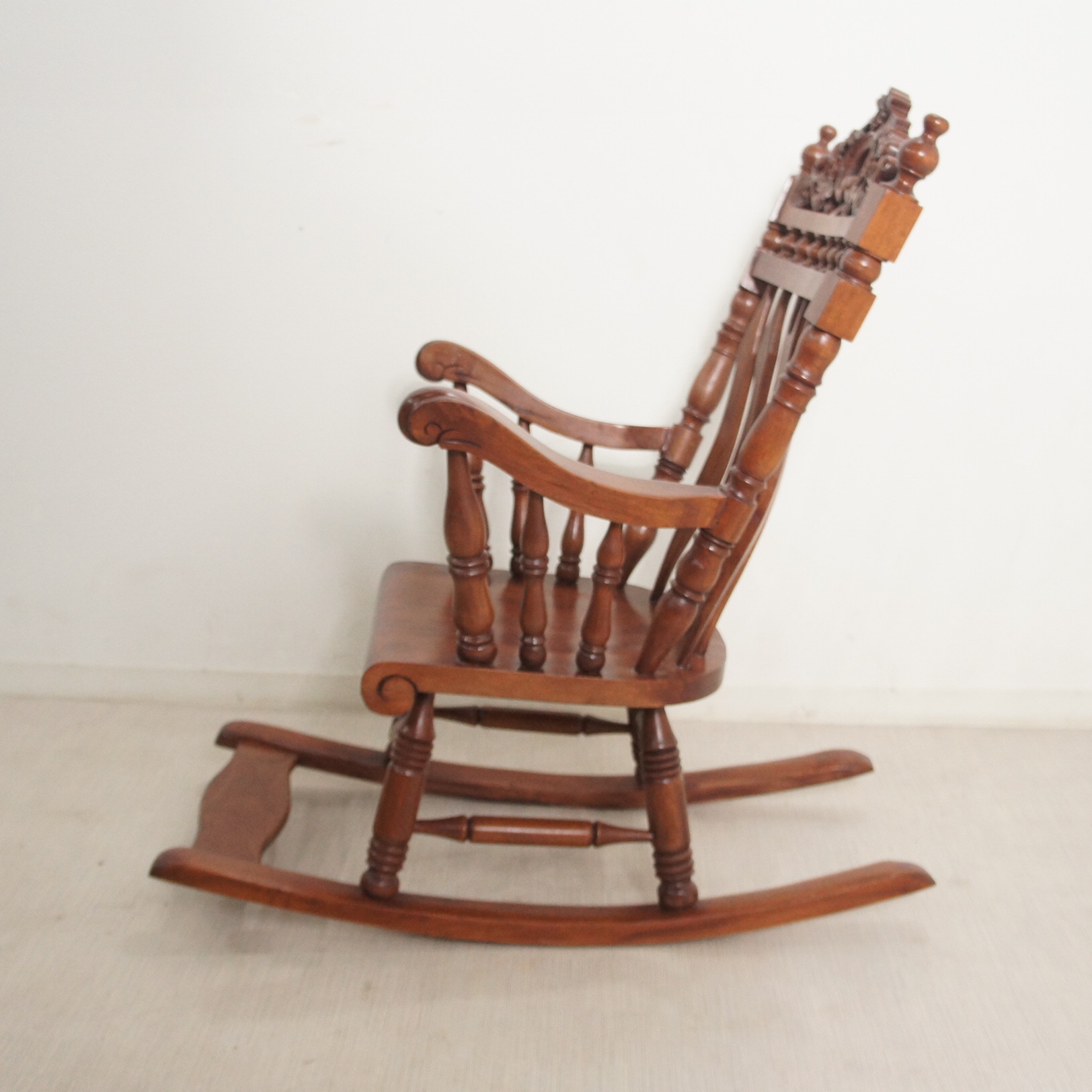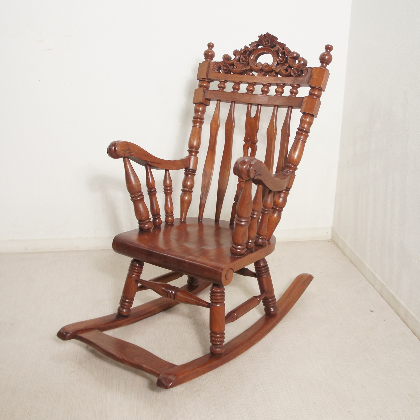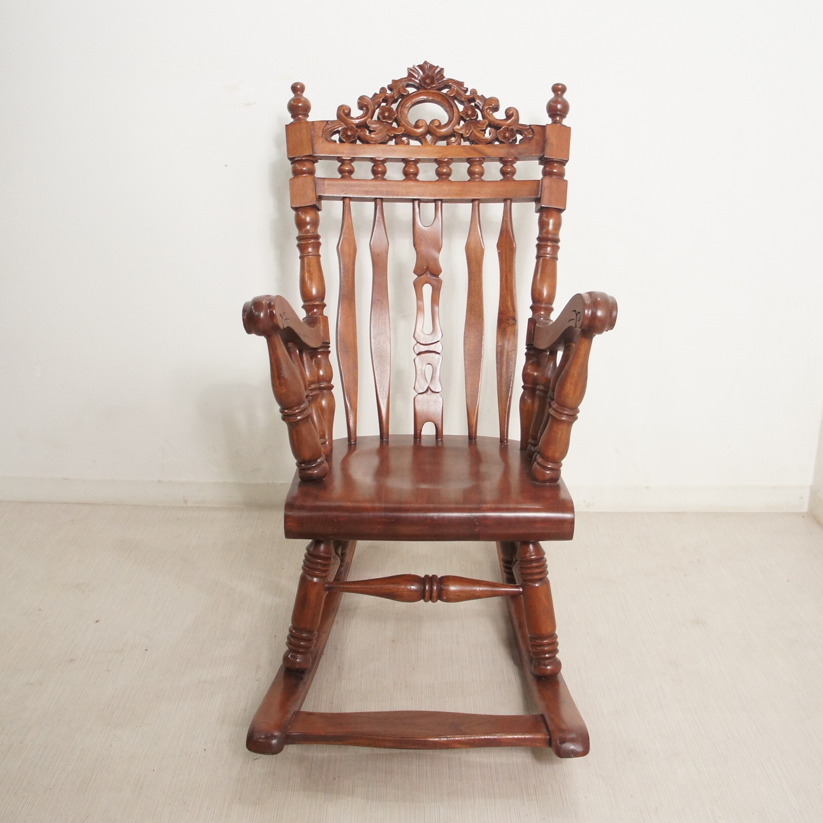 子供サイズのアンティークな雰囲気が漂うロッキングチェアです。 マホガニー無垢材を使用し時間の経過と共に味わい深くなっていきます。 装飾の彫刻やフレーム全てにおいて技ありの逸品です。