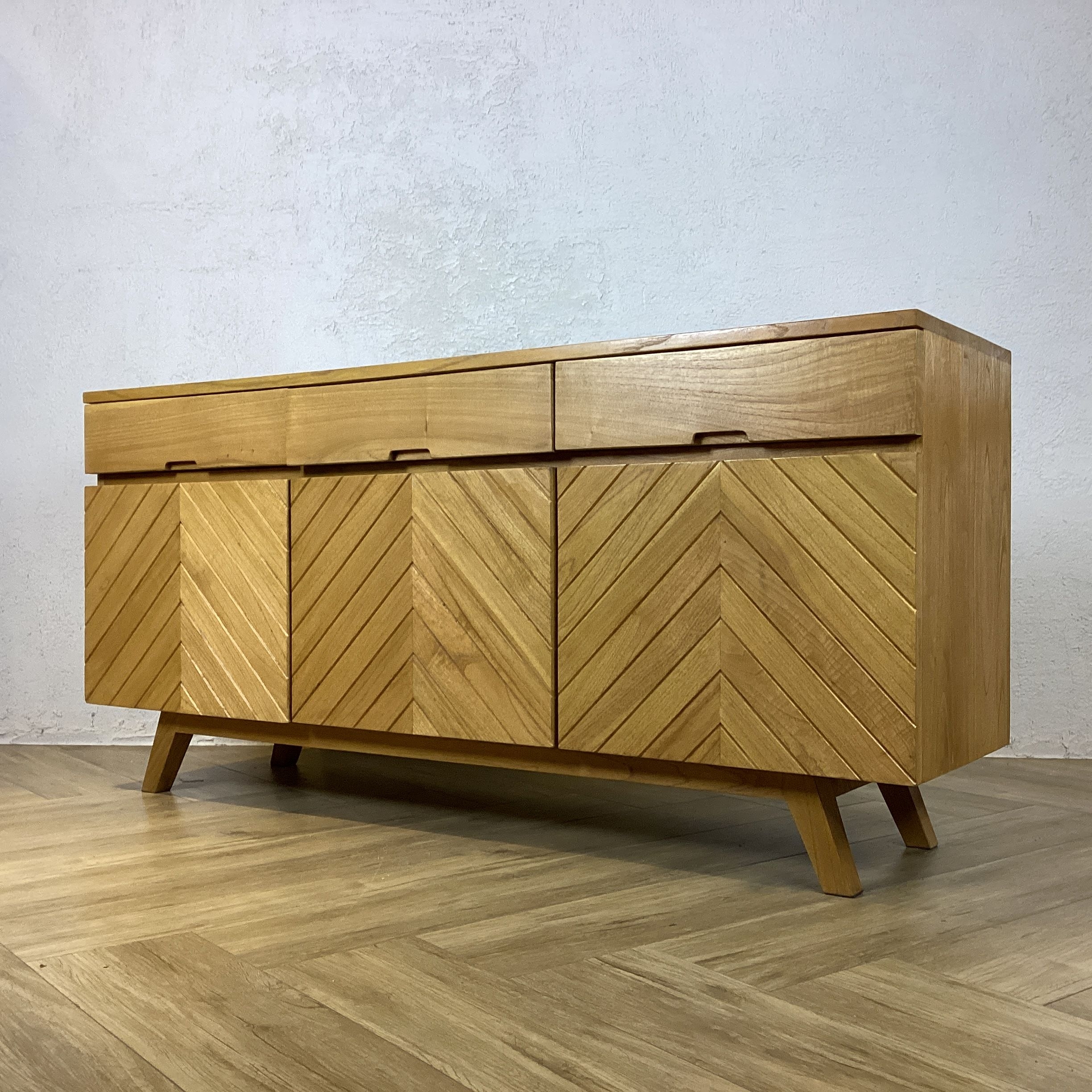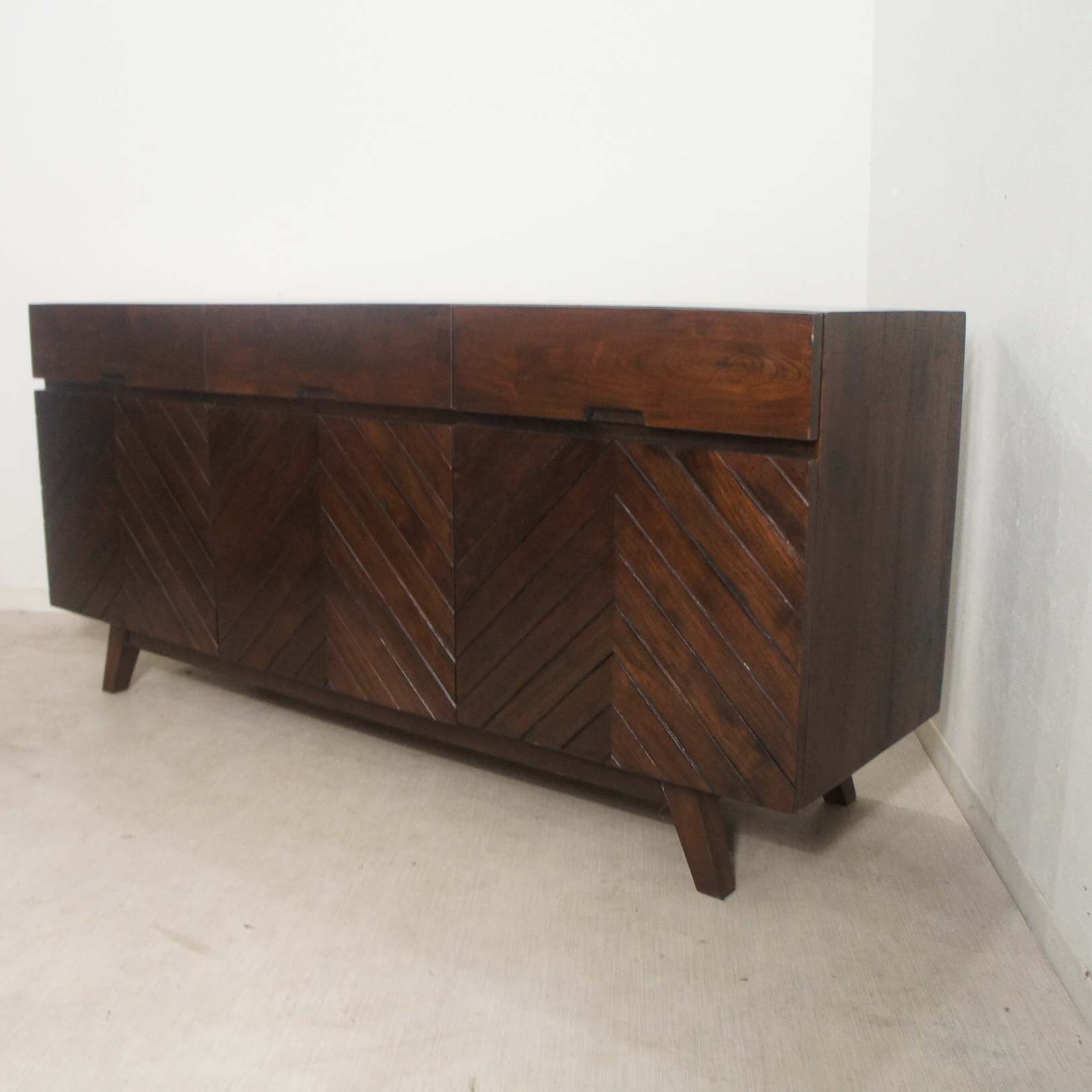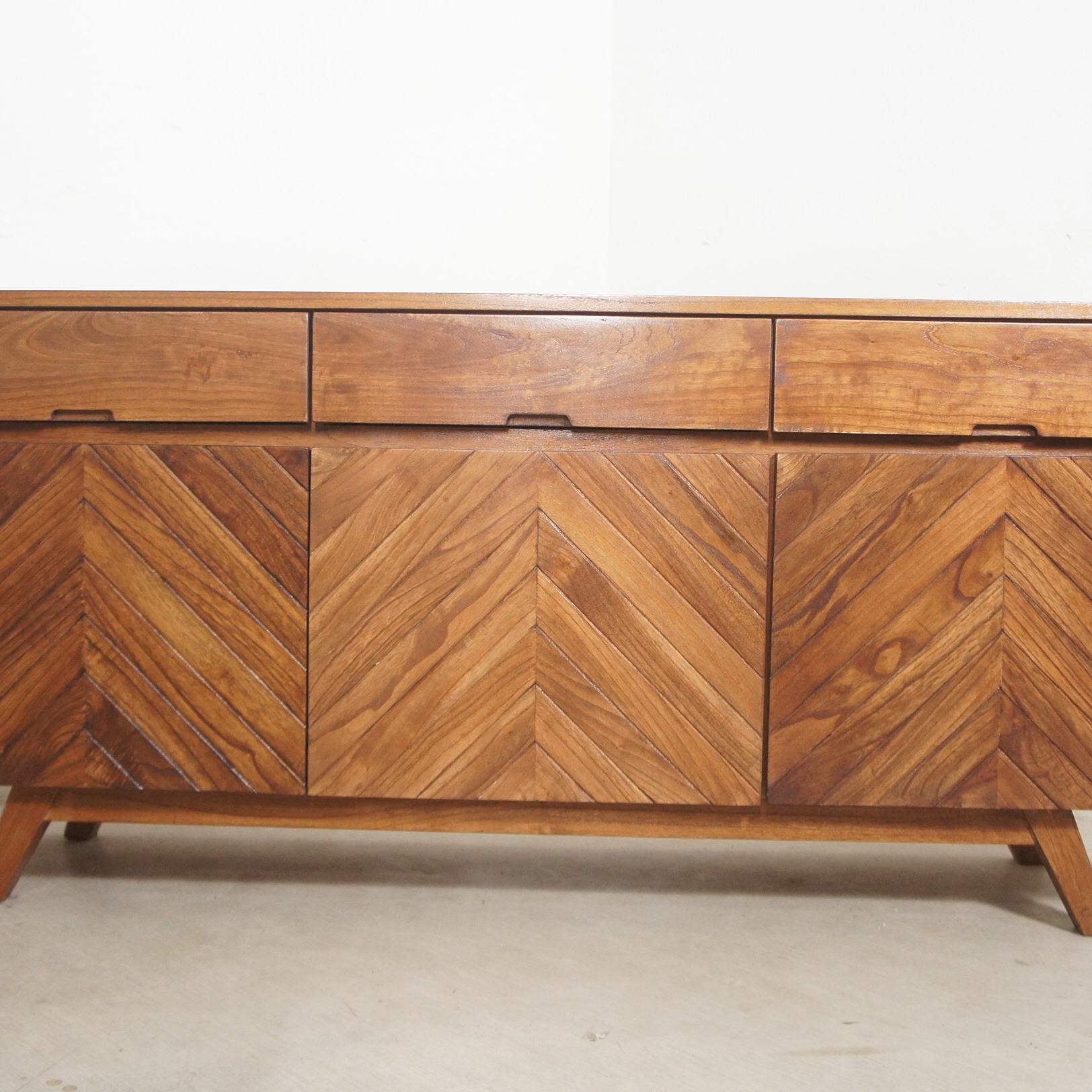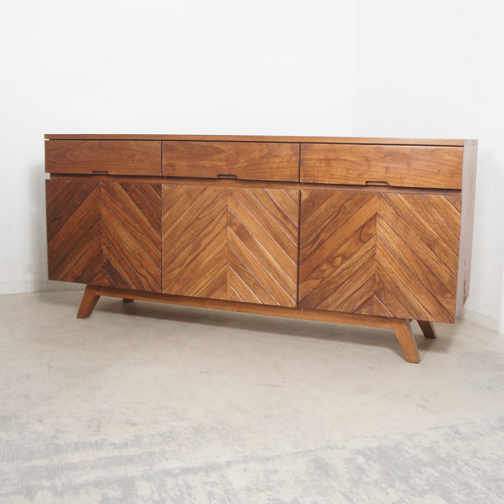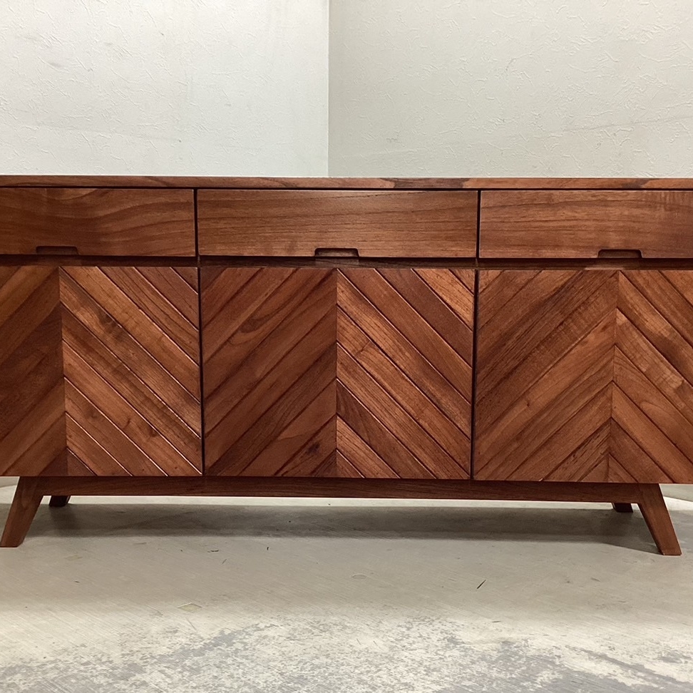 大きなヘリンボーン柄のドアが特徴的なロータイプキャビネットです。