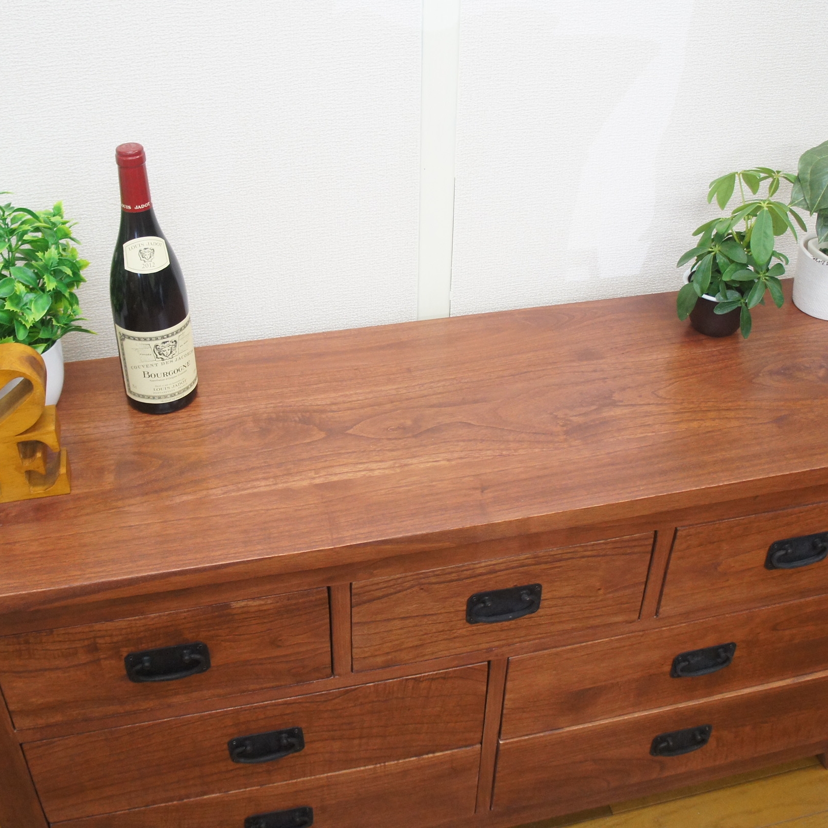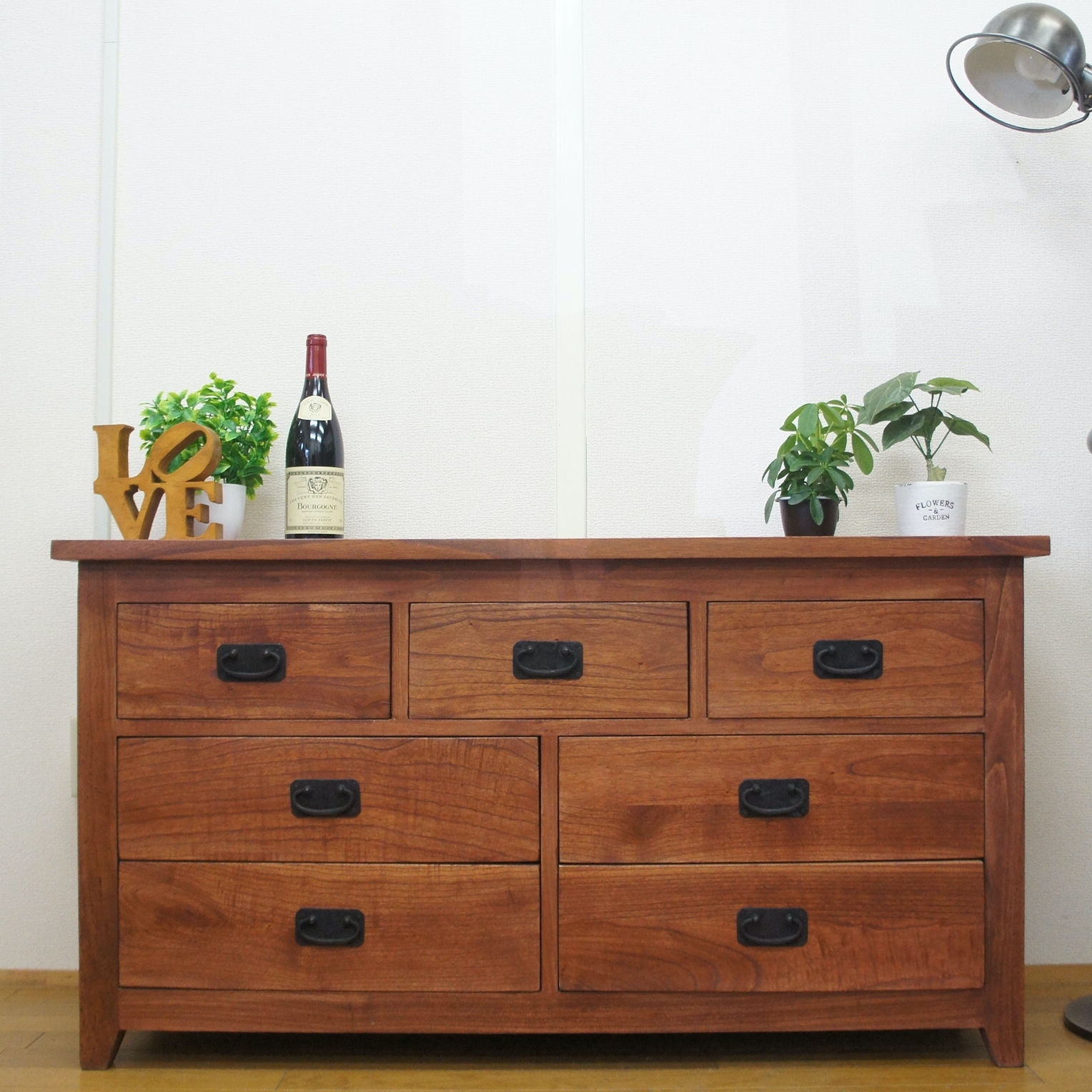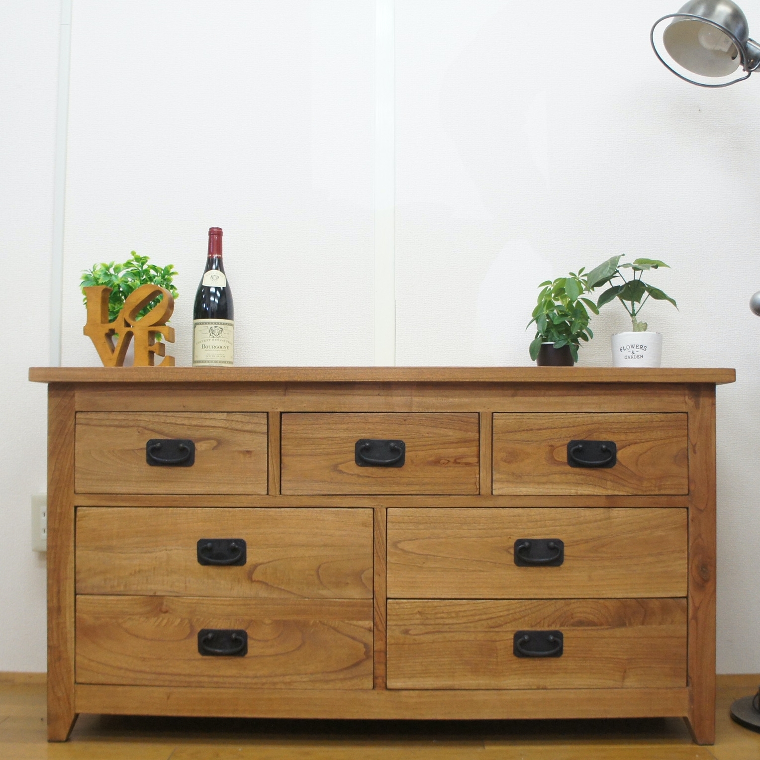 収納力たっぷりのリビングチェストです。 ブラスの取手がアンティーク感を醸し出して良い感じのデザインです。 高さも65cmで飾り棚としても重宝します。