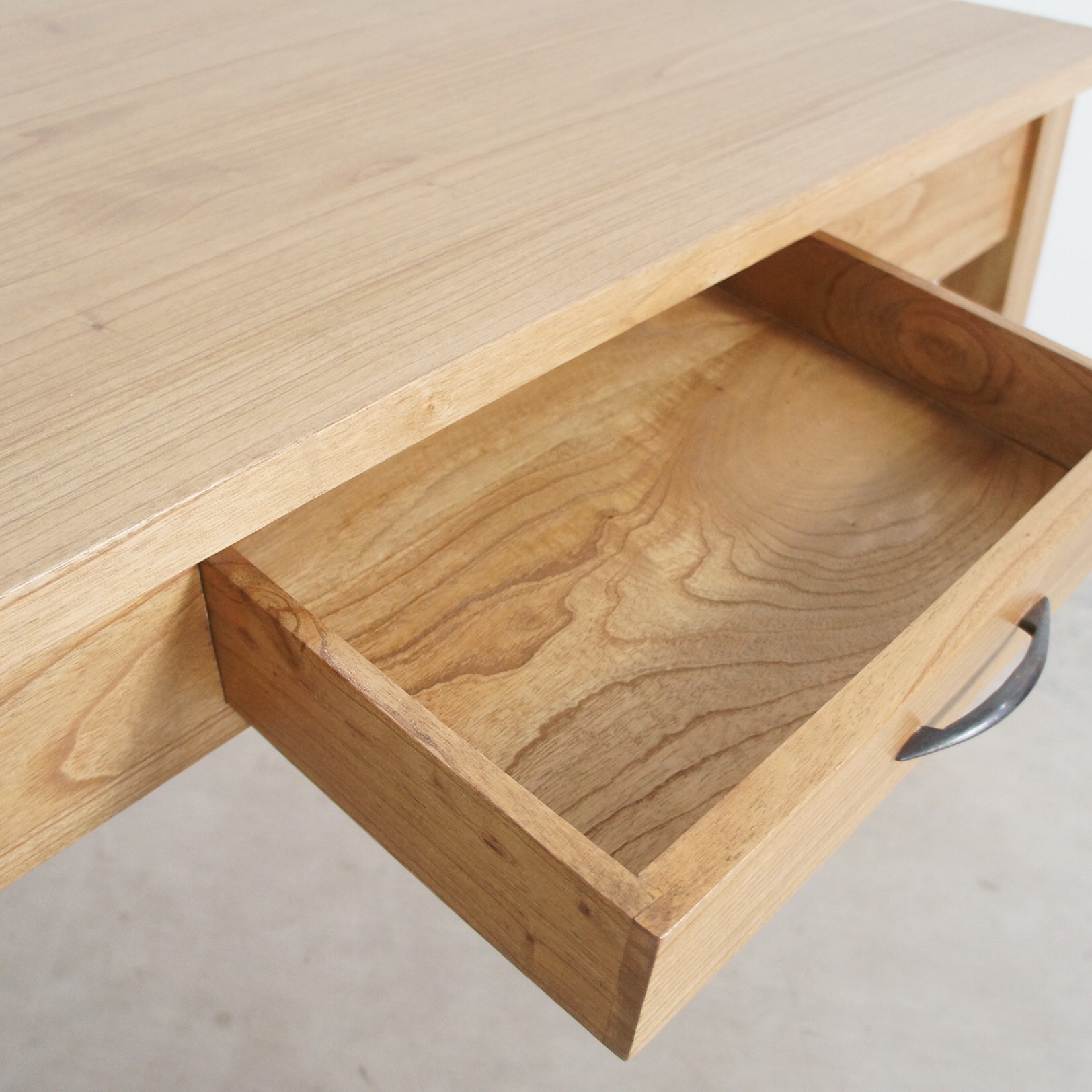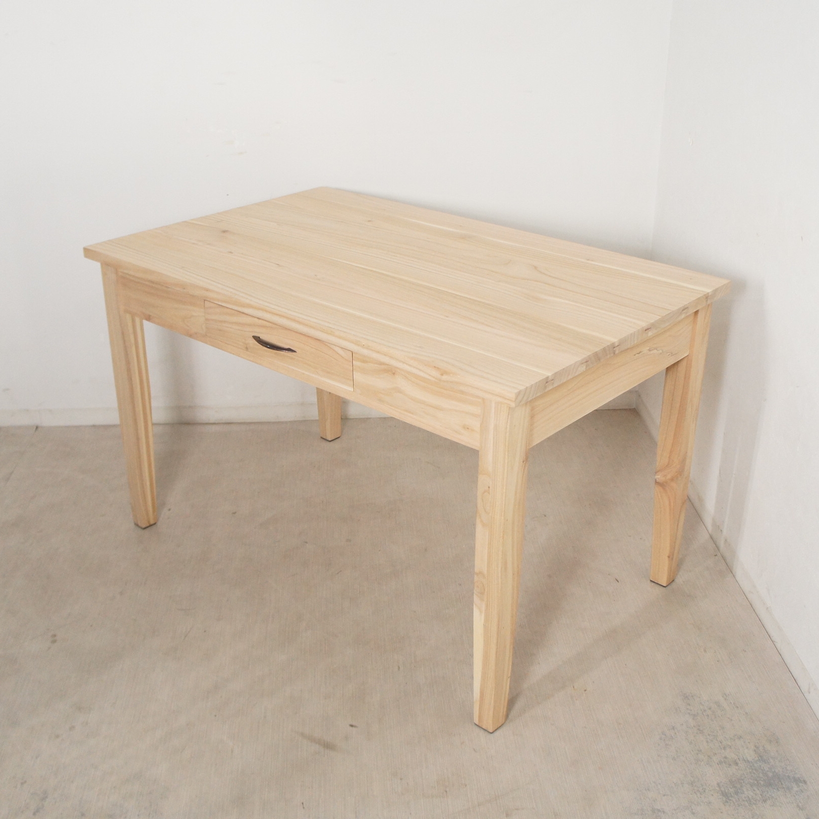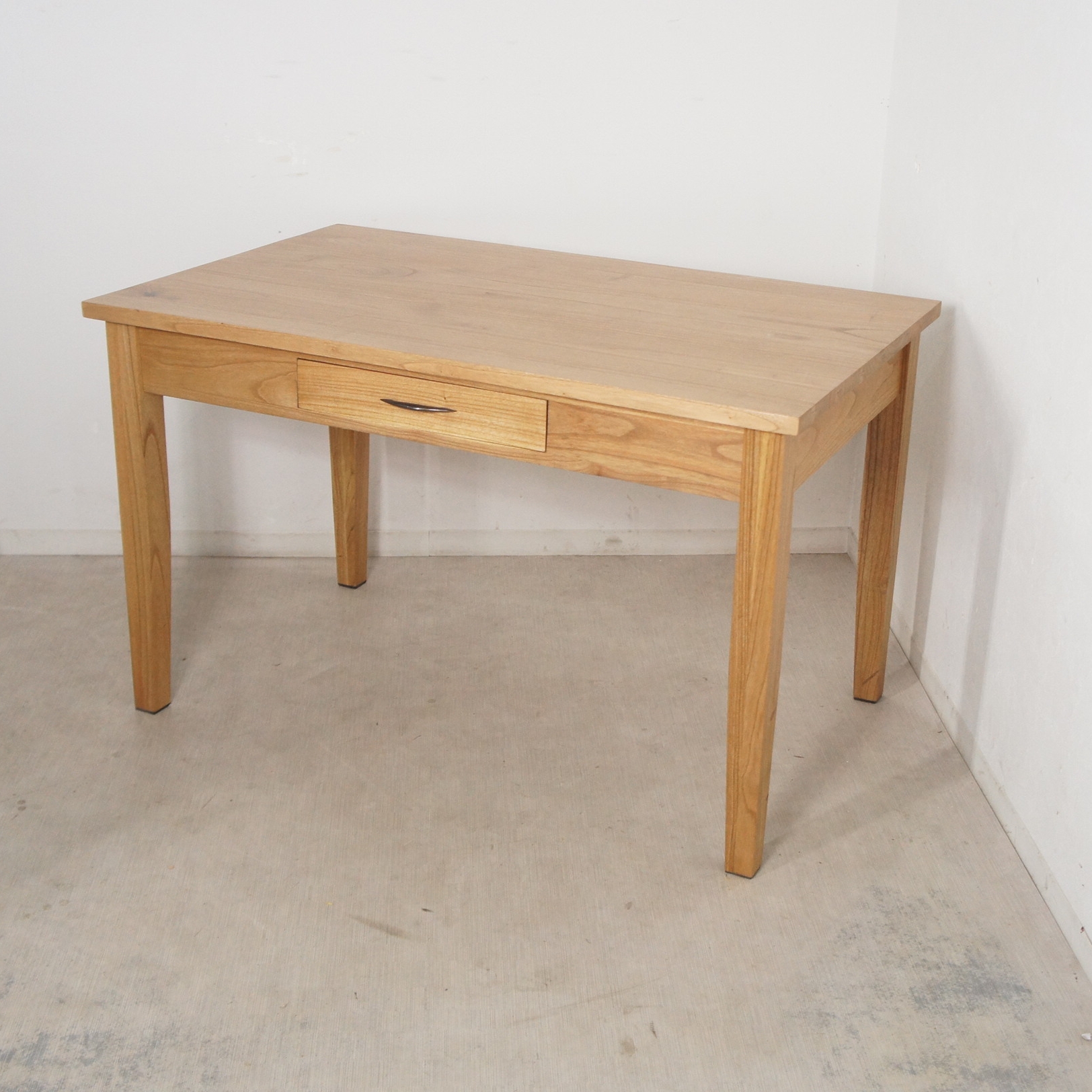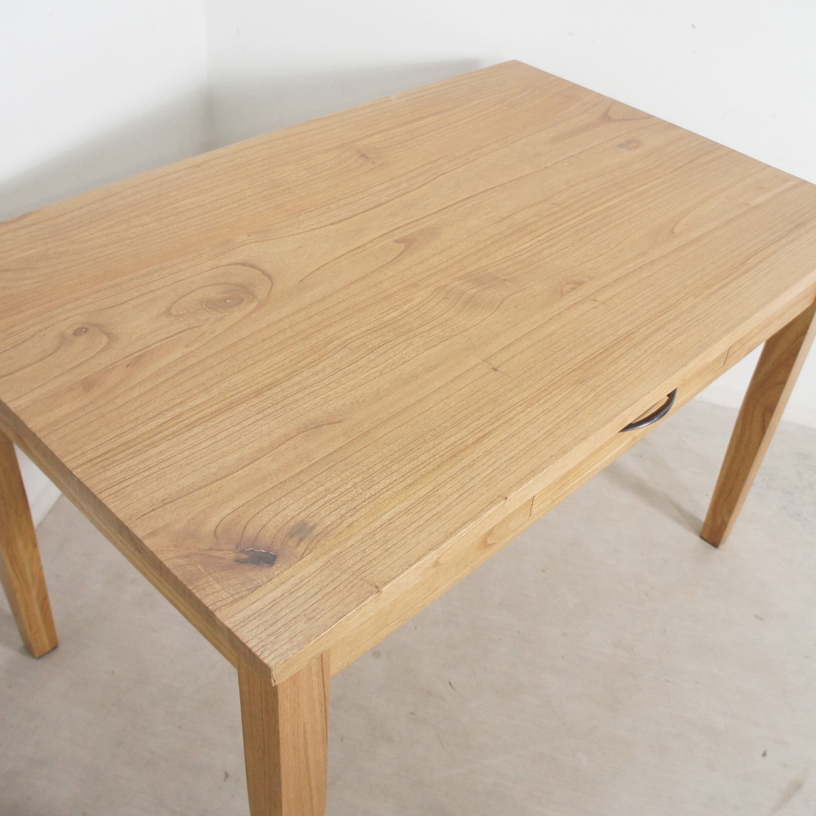 シンプルでスタイリッシュな木製ダイニングテーブルです。 引き出しが両面に1杯ずつついていますので、ナプキンや食器などちょっとした物を収めておけます。 ミンディの木目が良い感じです。