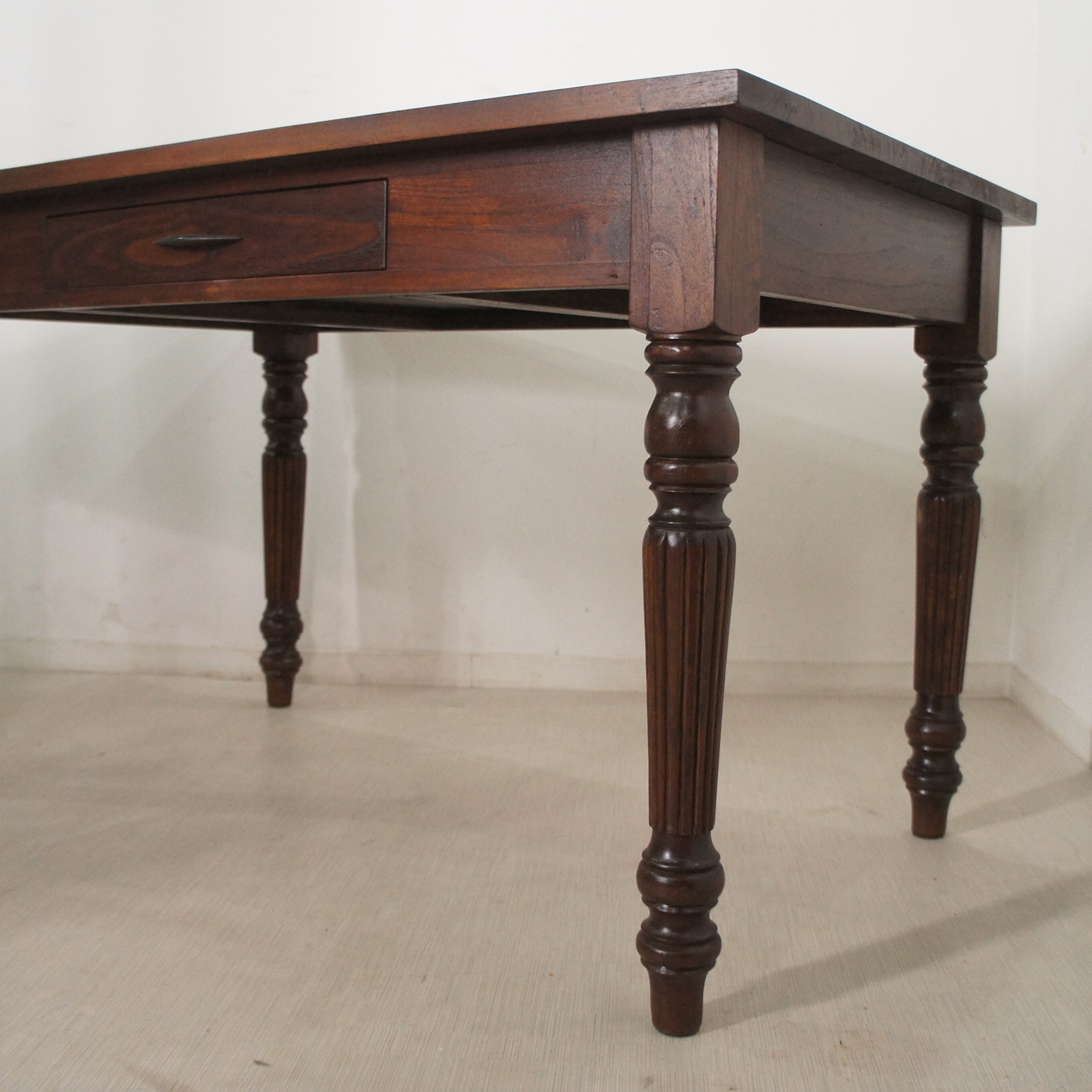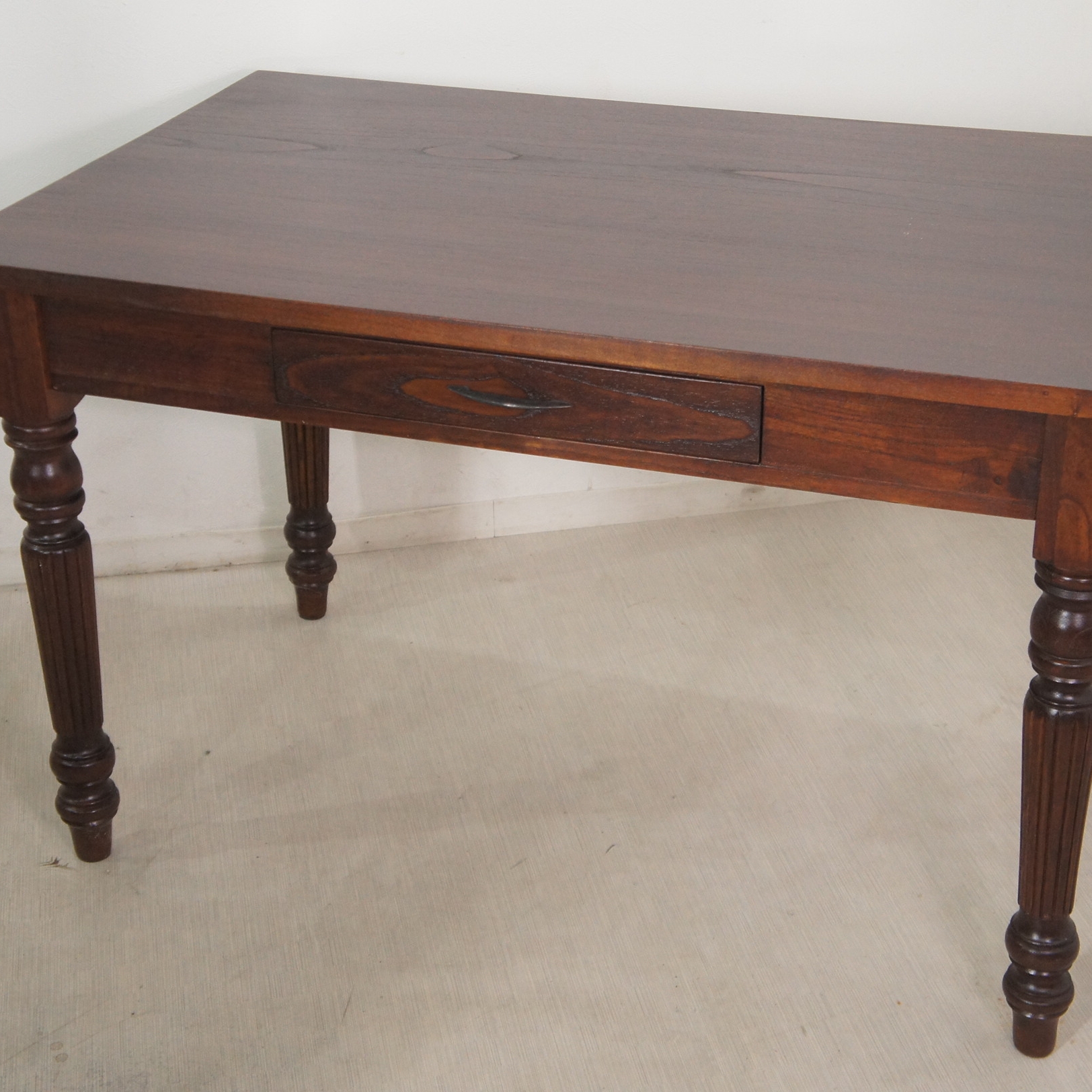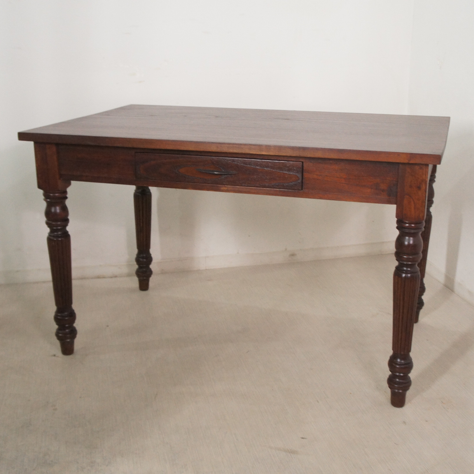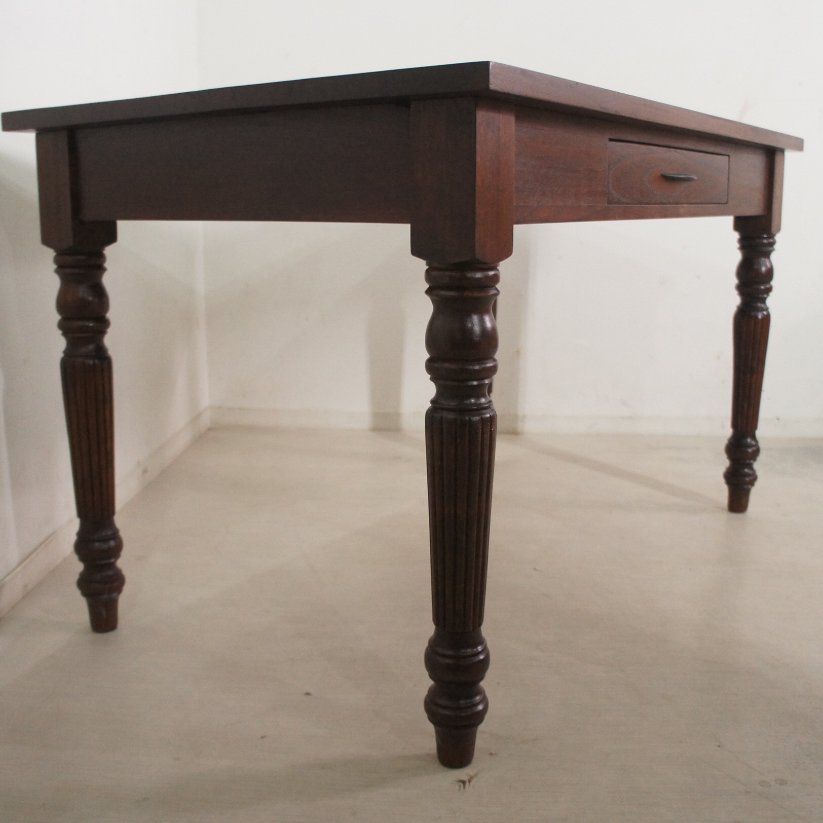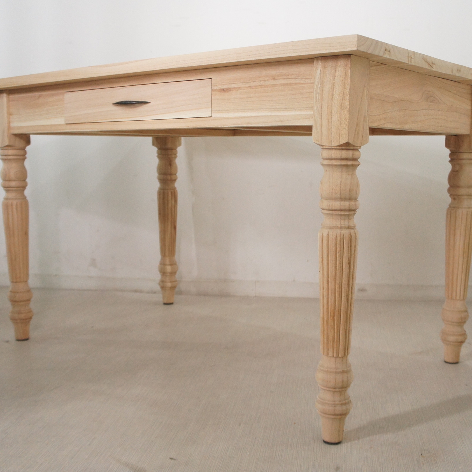 アンティーク調デザインでスタイリッシュな木製ダイニングテーブルです。 引き出しが両面に1杯ずつついていますので、ナプキンや食器などちょっとした物を収めておけます。 ミンディの木目が良い感じです。
