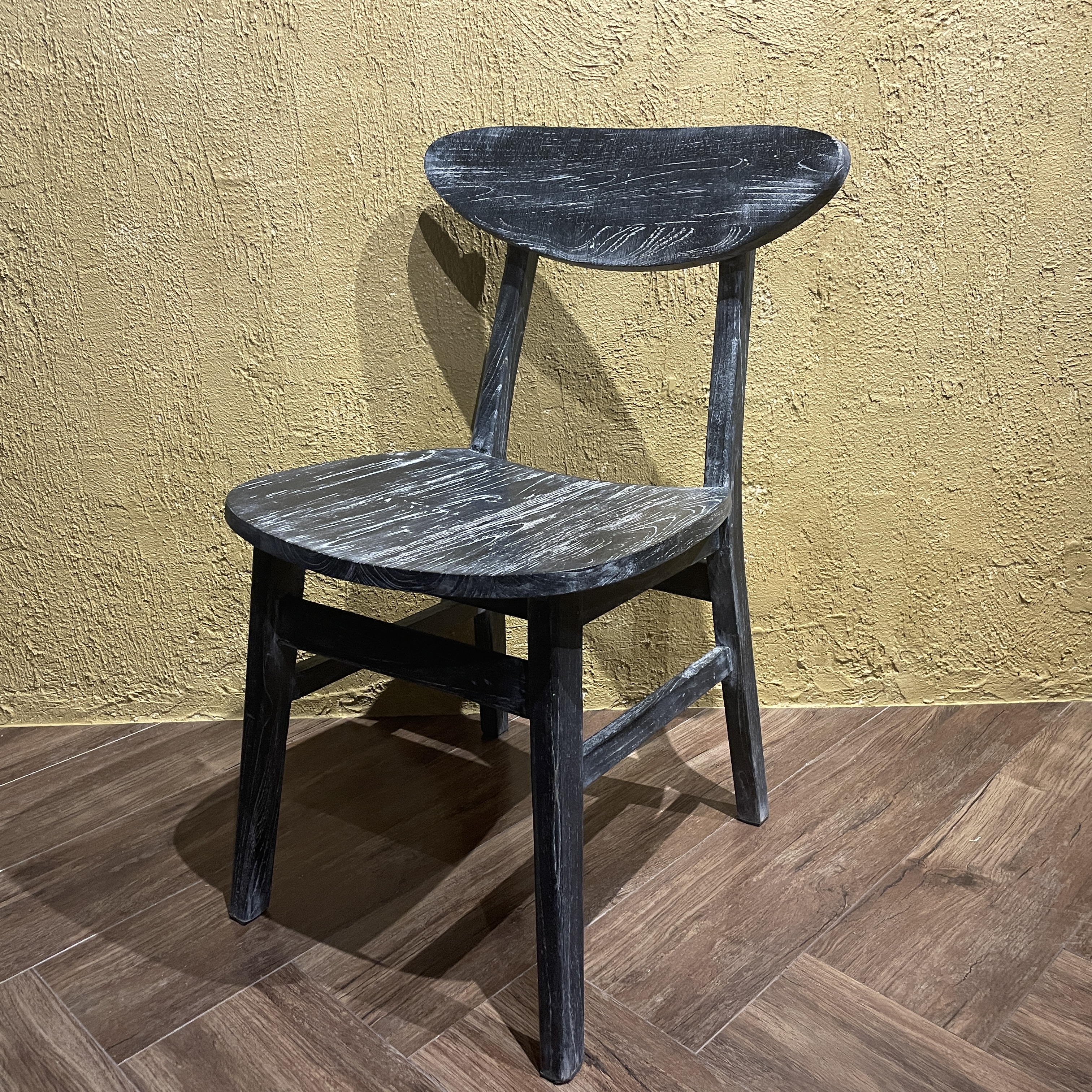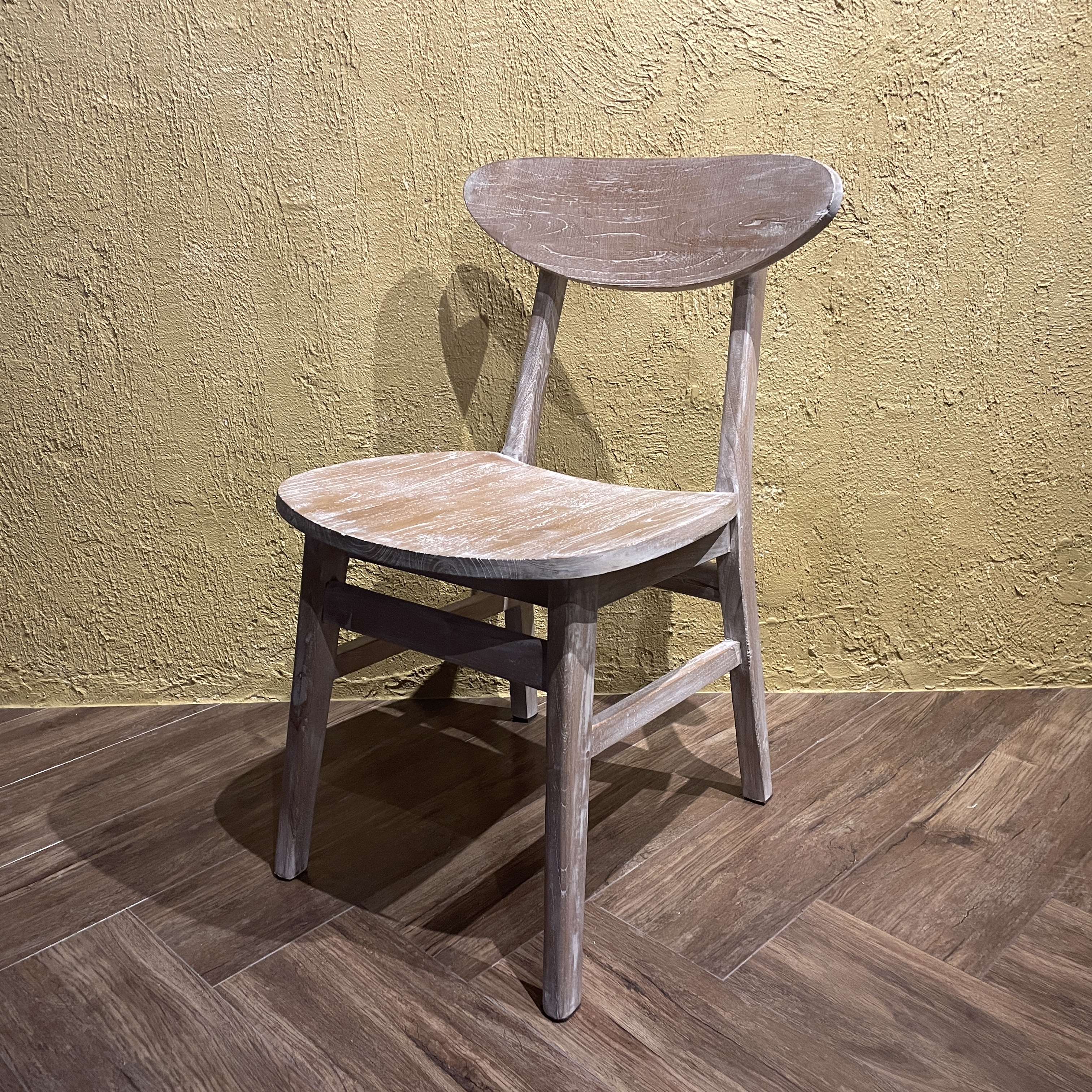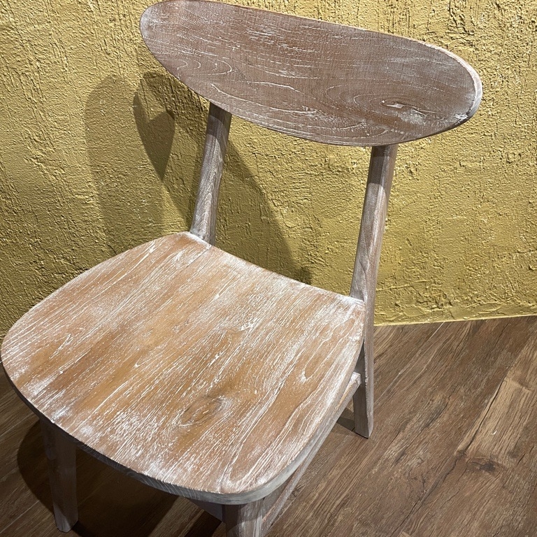 お洒落なウォッシュダメージ仕上げの木製チェアです。 チーク無垢材を使用しておりますので、丈夫で座り心地も良いです。 ダイニングチェアや、ワークチェアとして、いかがでしょうか?