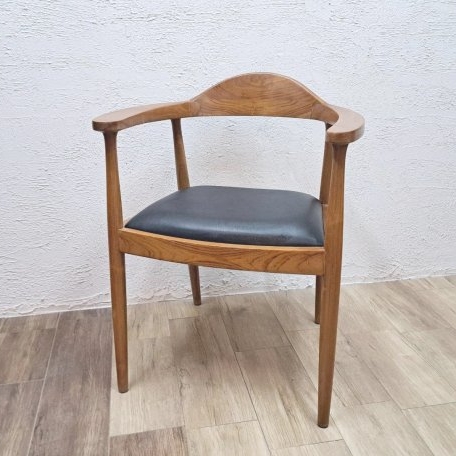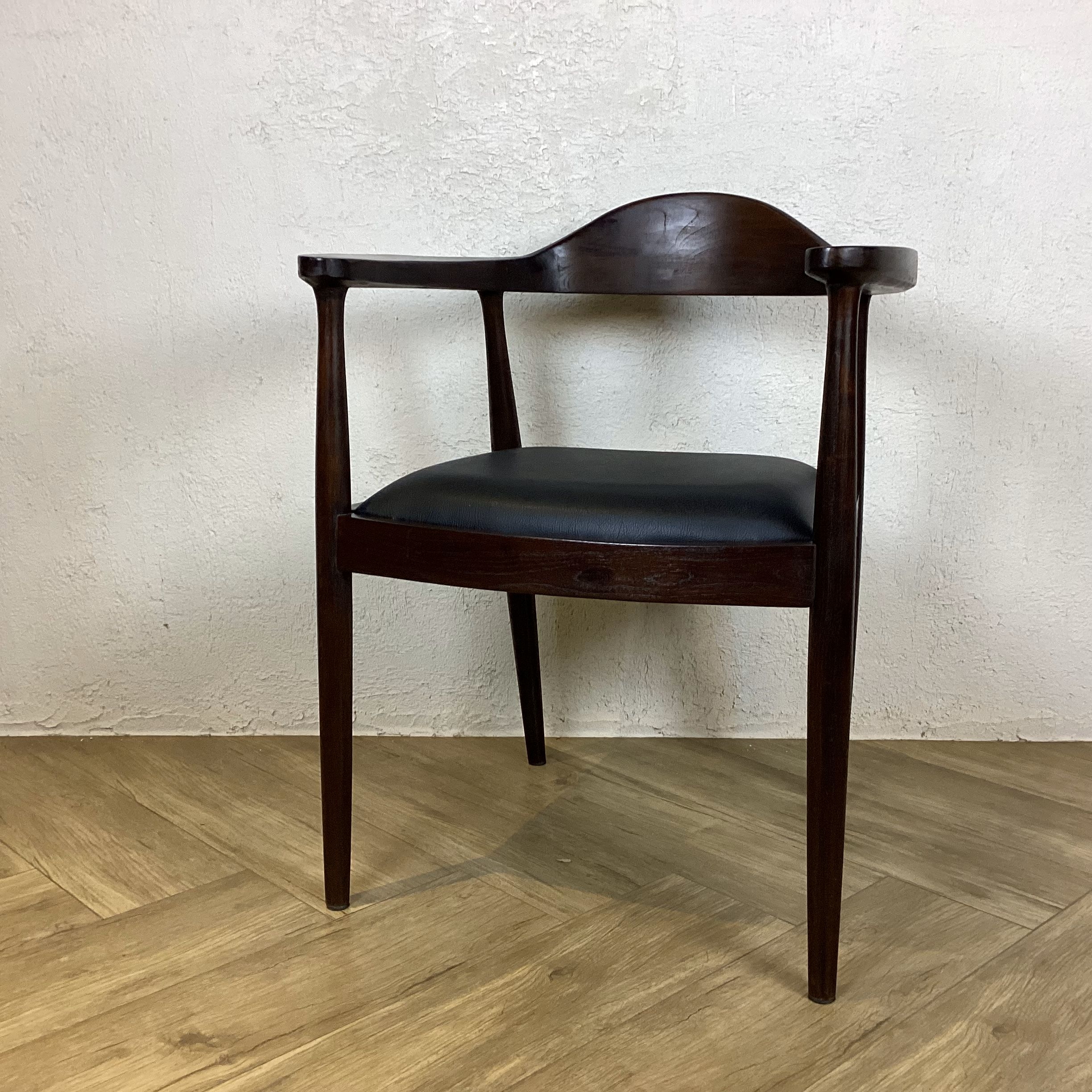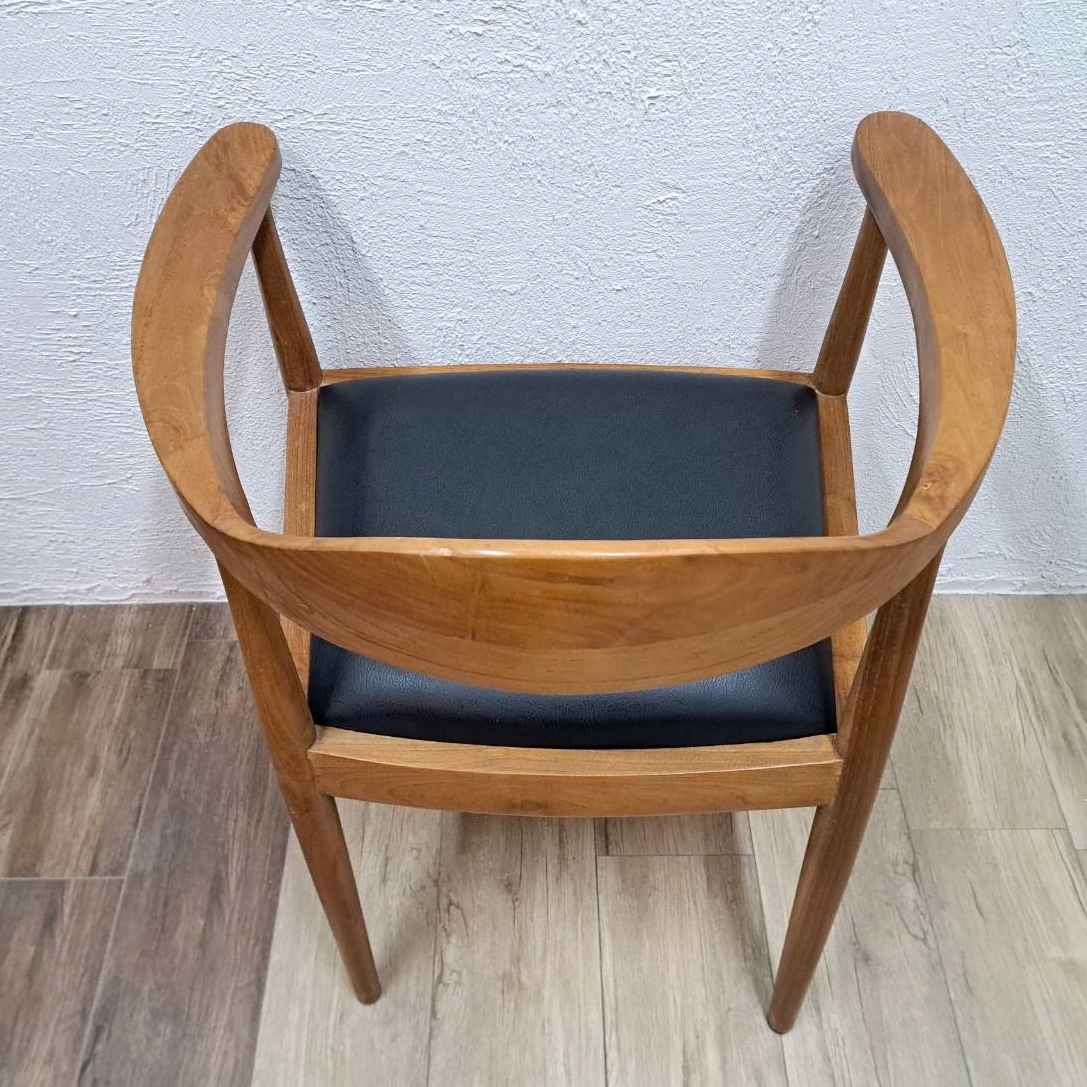 無垢材チーク、アームチェアです。 座面は合皮使用です。 背もたれはカーブしており、座面は大きめで 奥行もありますのでゆったりとお座り頂けます。 リビングやダイニングで活躍できそうです。