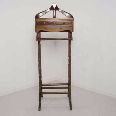 アンティーク調 マホガニー無垢のスーツ ハンガーラックです。 上着とズボンを掛ける部分が独立しており、小物を収納するにはピッタリの引き出しが2個、 さらに上部がトレーになっておりますので使い勝手は抜群です。 普段使いのスーツなどにいかがですか?